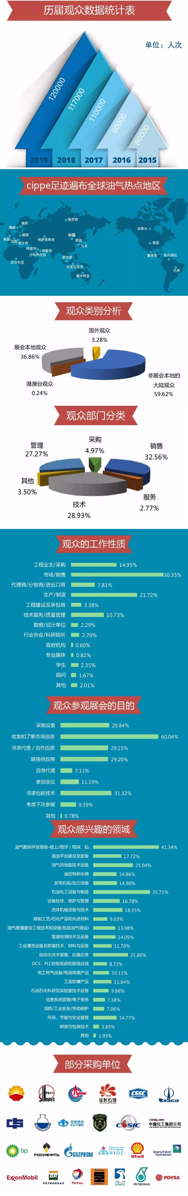 2020年,中石油、中石化、中海油總部參觀團(tuán),中石油物資公司、中石油勘探開發(fā)海外項(xiàng)目部、中國石油天然氣管道局、中石油海洋工程公司鉆井事業(yè)部、中石油渤海鉆探工程有限公司、中石化石油工程物資裝備部、中海油服采辦中心、中海油服油田技術(shù)事業(yè)部、大慶油田、遼河油田、勝利油田、大港油田、華北油田、延長石油、中外運(yùn)長航集團(tuán)、中遠(yuǎn)船務(wù)、中船重工、中國船舶工業(yè)集團(tuán)、國家能源液化天然氣技術(shù)研發(fā)中心、海隆油服、惠生工程、伊拉克石油部代表團(tuán)、蒙古國礦產(chǎn)石油局、Busan Marine Equipment Association、沙特阿美、阿布扎比國家石油公司、阿布扎比國家能源公司、阿布扎比國家石油建設(shè)公司、愛沙尼亞國家能源公司、俄氣、俄油、俄管道、馬來西亞國家石油、哈薩克斯坦國家天然氣運(yùn)輸公司、阿塞拜疆國家石油、日本鉆井公司、殼牌、道達(dá)爾、康菲、福陸工程、現(xiàn)代重工、德希尼布FMC、英國派特法石油工程公司、挪威船級社、三星重工、Oceaneering、Sembcorp Marine、Global Marine Services等百余個(gè)國內(nèi)外專業(yè)采購團(tuán)將繼續(xù)到cippe展會(huì)現(xiàn)場參觀。