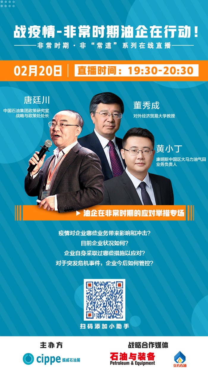 2月20日起,非常時(shí)期 · 非常道系列在線直播會(huì)議將陸續(xù)推出:油企在非常時(shí)期的應(yīng)對(duì)舉措專場(chǎng)、疫情與油氣國(guó)際市場(chǎng)專場(chǎng)、疫情下國(guó)際油價(jià)走勢(shì)專場(chǎng)、2020中國(guó)石油經(jīng)濟(jì)和市場(chǎng)發(fā)展形勢(shì)四個(gè)專場(chǎng)在線直播內(nèi)容。來(lái)自國(guó)家發(fā)改委、中國(guó)石油集團(tuán)、中國(guó)石油經(jīng)濟(jì)技術(shù)研究院、中國(guó)石油大學(xué)、石油裝備生產(chǎn)企業(yè)、國(guó)際知名能源研究咨詢公司等專家和企業(yè)代表,將集中入駐本次直播會(huì)議針對(duì)專題內(nèi)容發(fā)言討論。