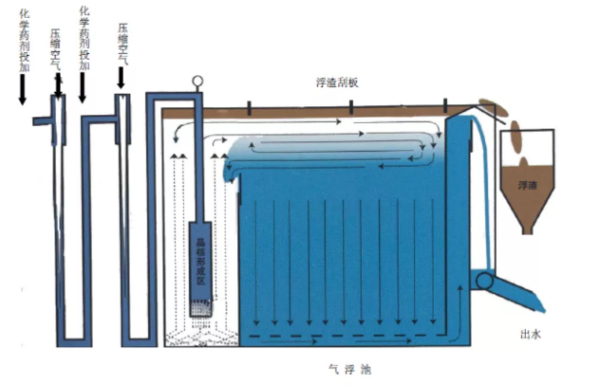 • 固液分離在渦流三相混合器中已經(jīng)完成,氣浮池僅需絮體集結(jié)刮渣即可。