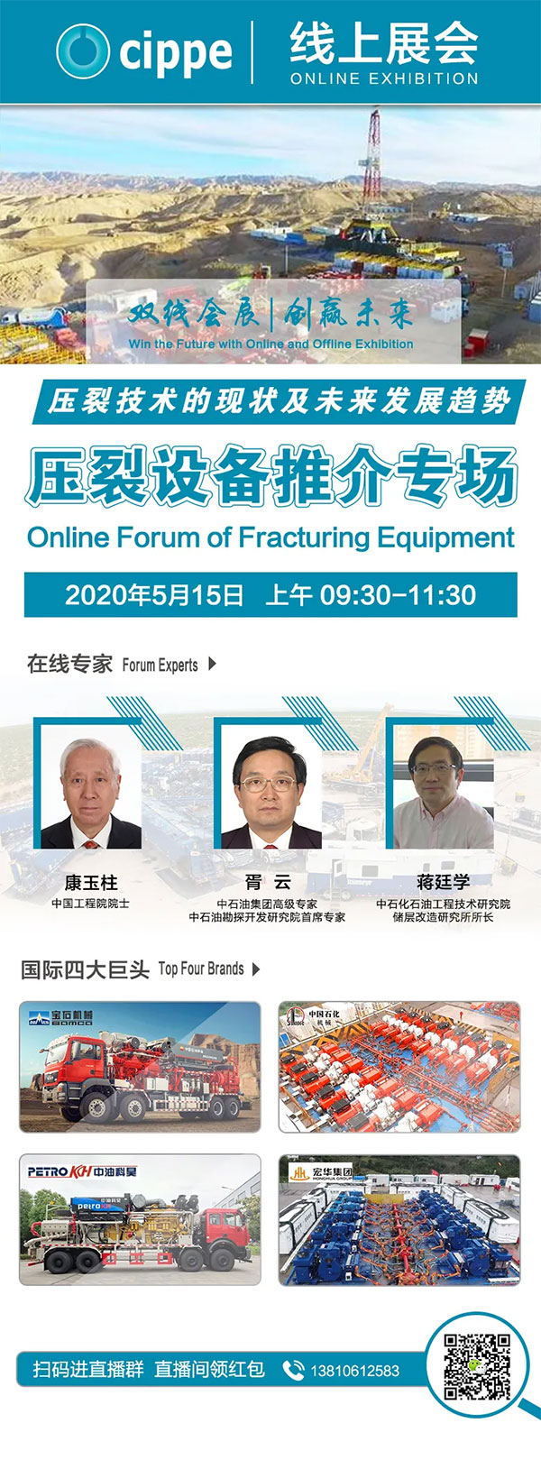 cippe組委會也邀請了中國工程院院士康玉柱,中石油集團(tuán)高級專家、中石油勘探開發(fā)研究院首席專家胥云,中石化石油工程技術(shù)研究院儲層改造研究所所長蔣廷學(xué)等專家蒞臨直播間,并就“壓裂技術(shù)的現(xiàn)狀及未來發(fā)展趨勢”這一主題進(jìn)行市場分析。歡迎您屆時進(jìn)入直播間觀看直播。
