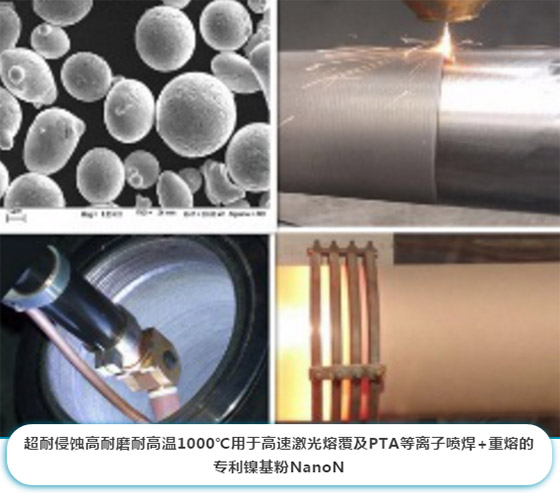 NanoNF及NanoN用途為:各種超耐腐蝕、高耐磨、耐高溫的零件,包括:長粗軸、液壓支柱、套管、紙漿輥、柱塞的高速激光熔覆,或普通激光堆焊眼鏡管、耐高溫玻璃模具,擺動等離子超薄堆焊代替高級鍍硬鉻、長細管內(nèi)壁堆焊,海水侵蝕等。