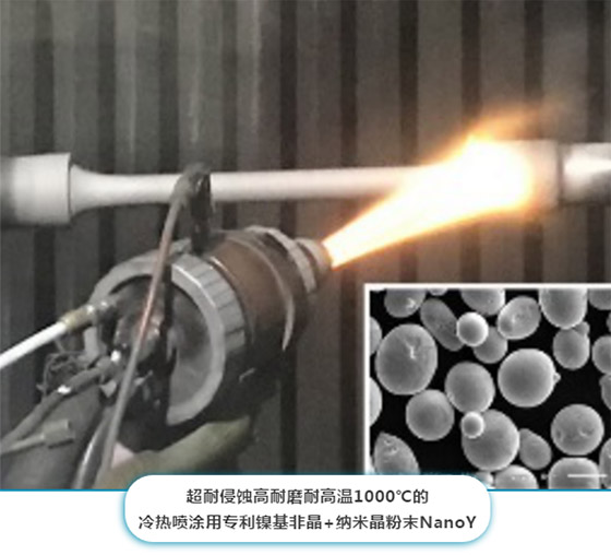 奧泰新材專利粉末NanoY是獨特的鎳基合金,有均勻的非晶+納米晶微觀組織,包括8-25um、15-45um、3-10um等粒度。超音速火焰熱噴涂中采用比碳化 鎢略低的熱輸入和快冷后的涂層組織中非晶率可以高于粉末。