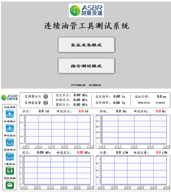 連續(xù)油管工具測試系統(tǒng),其操控方式模擬連續(xù)油管主操控制系統(tǒng),具有泵壓采集模式和綜合測試模式。根據(jù)不同的工具和不同的連續(xù)油管工藝,可輸入不同的排量和拉力,輸出泵壓、扭矩、位移、ROP、時間等參數(shù)。