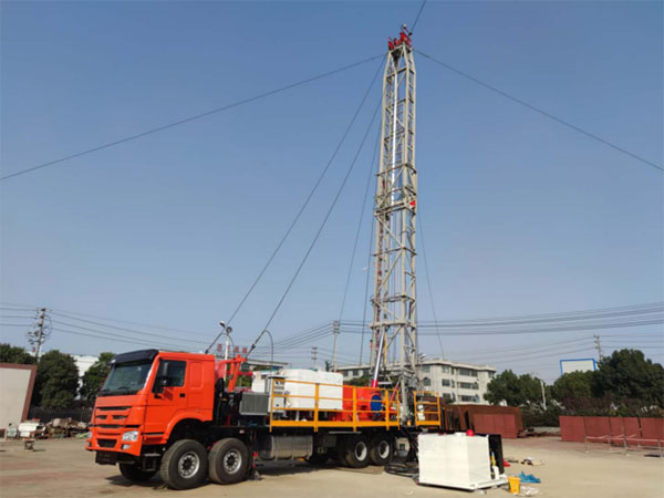 車裝鉆機(jī)是將動(dòng)力系統(tǒng)、絞車、井架、游車系統(tǒng)及傳動(dòng)系統(tǒng)等部件全部裝載于自走式底盤上,具有作業(yè)負(fù)荷大、性能可靠、越野能力強(qiáng)、移運(yùn)方便,作業(yè)和搬遷費(fèi)用低等特點(diǎn)