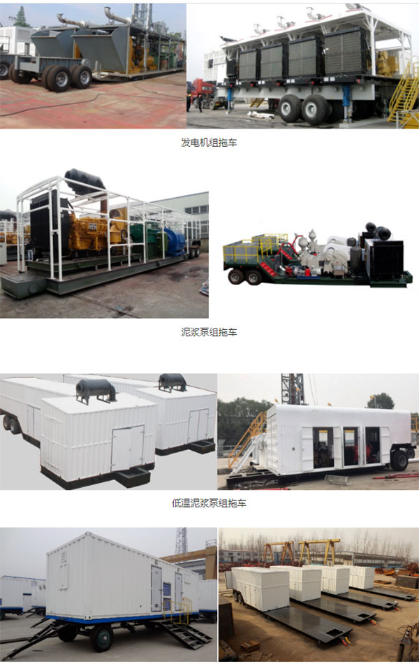 該系列拖車主要用來整體運(yùn)輸鉆機(jī)現(xiàn)場泥漿泵組、發(fā)電機(jī)組、氣源房、固控系統(tǒng)、油水罐等設(shè)備??梢詫?shí)現(xiàn)設(shè)備的整體快速搬遷。