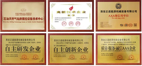 西安正道能源機械設備有限公司經過多年的發(fā)展,在業(yè)界得到眾多權威機構認可,獲得了眾多殊榮,其中包括:鉆井固 控設備技術中心榮譽;高新技術企業(yè)榮譽;AAA級信用單位榮譽;自主創(chuàng)新企業(yè);自主研發(fā)企業(yè);質量服務誠信企業(yè)等。
