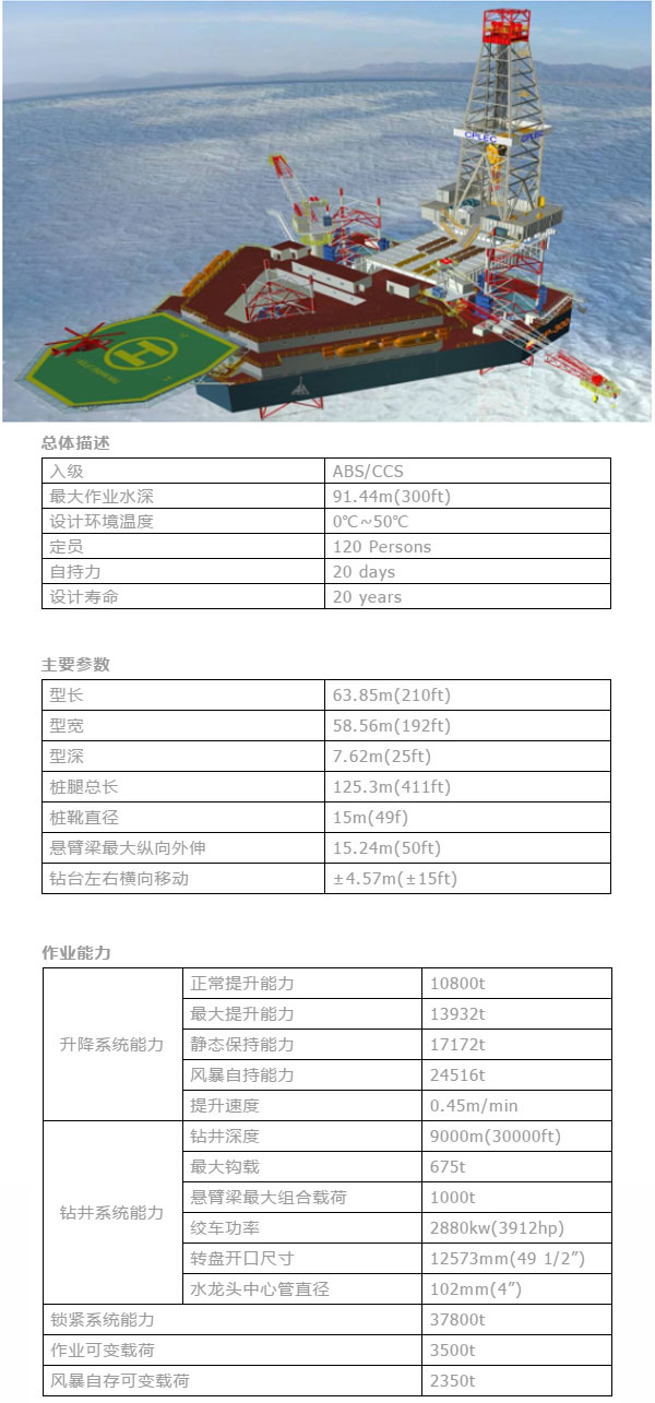 CP-300自升式鉆井平臺為我國第一艘具有完全自主知識產(chǎn)權(quán)的自升式鉆井平臺。它標(biāo)志著我國突破了國外自升式鉆井平臺核心技術(shù)的封鎖,實(shí)現(xiàn)了由“中國制造”向“中國創(chuàng)造” 的轉(zhuǎn)折。該平臺配備9000米海洋鉆井模塊,可滿足所有300英尺水深以內(nèi)海域的勘探開發(fā)需要,具備鉆井、固井和輔助試油等功能。