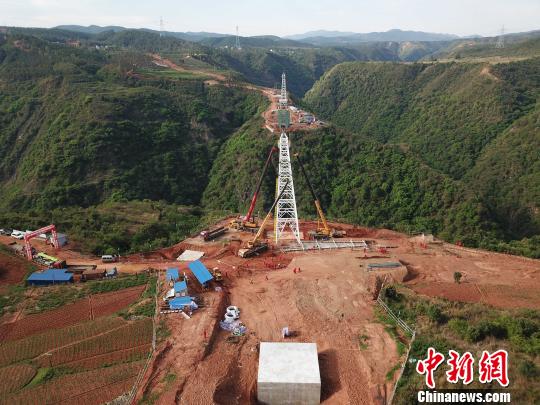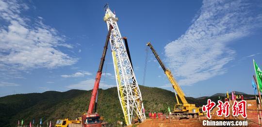 圖為勐崗河懸索跨越北岸塔架吊裝作業(yè)現(xiàn)場?!∪A昱翔 攝