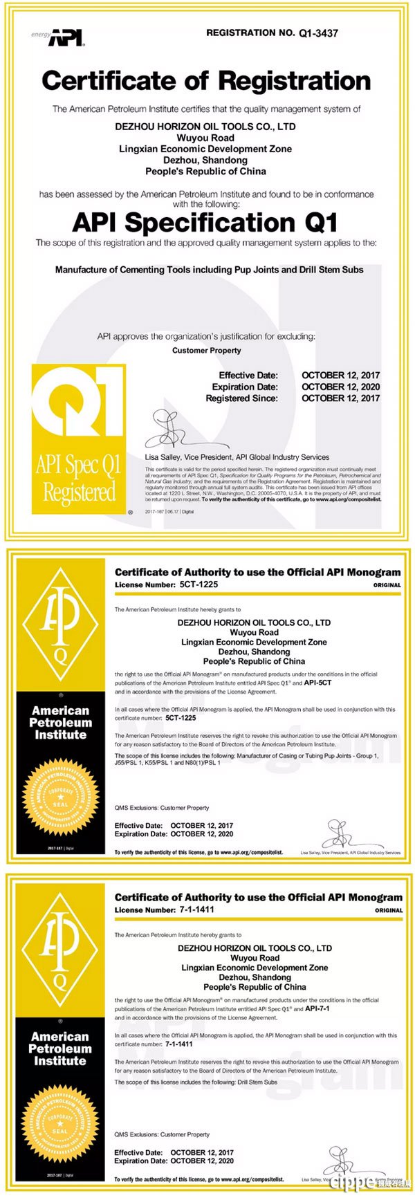 ◆ 通過美國石油協(xié)會(huì)API 5CT、API 7-1、API Q1相關(guān)認(rèn)證,并取得證書;